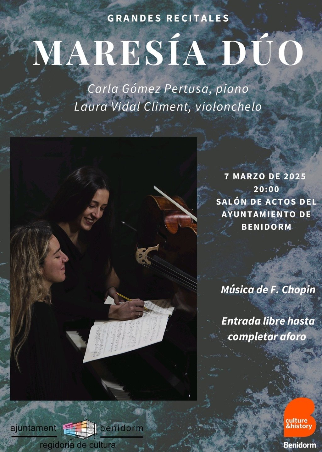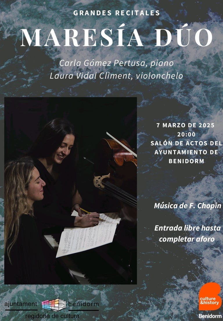 Laura Vidal on cello and Carla Gómez on piano are two young musicians who have studied at the Conservatorio Superior de Música de Alicante as well as at other institutions across Europe, including Bari, Warsaw, and Ghent. In addition to their distinguished careers as soloists and orchestral performers, they share a deep passion for chamber music, which led them to found this duo in 2019.